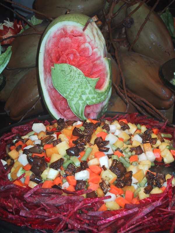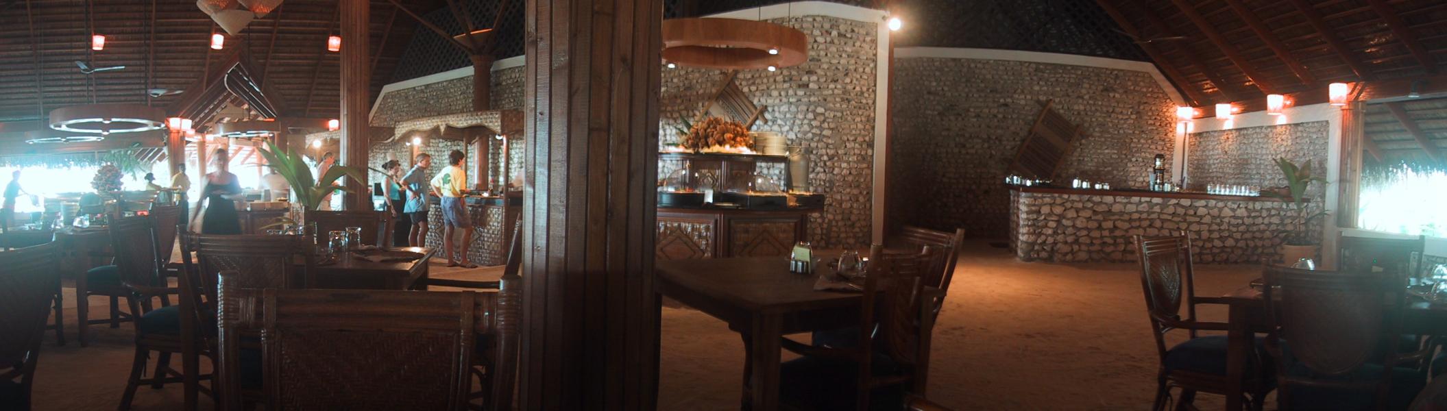 Besonder viel Mühe geben sich die Mitarbeiter im Restaurant. Alle drei Hauptrestaurants, zwei gleich bei der Mole bzw. bei der Rezeption in der Mitte der Insel und eines am Westzipfel der Insel, für die Bewohner der Wasservillen. Neben den Hauptrestaurants gibt es noch drei A-la-carte-Restaurants, die wir aber heuer nicht besuchten. Die Hauptrestaurants werden als Buffets mit Selbstbedienung geführt. Eine Übersicht über den Bereich vom Eingang bis zur Bar zeigt das folgende Bild, das aus 4 Photos zusammengesetzt ist.