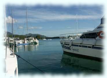 Am Angel Fish Harbor angekommen ist leider noch niemand von der Basis von Dream Yacht Charter vor Ort, aber die Zeit der Übergabe war ja noch nicht gekommen und auf Mahé befindet sich auch nicht die Hauptbasis der Dream Yacht Charter. Nachdem wir im Hafen ein bisschen herumgeschaut haben, fanden wir 2 Lagoon 440. Inzwischen werden unsere vorbestellten Waren (Getränke, Lebensmittel und Sonstiges) geliefert und auch direkt auf die Lagoon gebracht. Jetzt wußten wir welche uns die nächsten 2 Wochen begleiten sollte: unsere ist natürlich die optisch ältere. Schließlich kommt Thierry direkt von Praslin, wo sich die Hauptbasis von Dream Yacht Charter befindet, um die Übergabe durchzuführen.