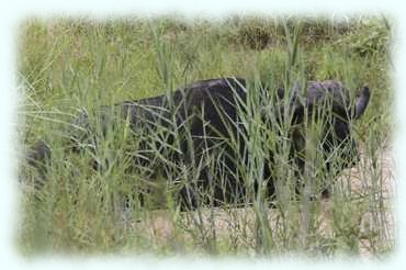 Ute sieht immer wieder Spuren von Büffel, teilweise recht frisch und auch die von größeren Herden. Es dauert dann aber doch bis zum Nachmittag, als wie einen einzelnen Büffel bei einer Wasserstelle liegend sahen. Kurze Zeit später dann ein Gruppe von 3 Kaffernbüffel, die es sich ebenfalls bei einem Wasserlauf gemütlich machten.