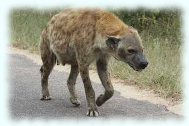 Hyänen sind ob des trockener werdenden Klimas im Süden des Kruger Nationalparks nicht mehr so oft anzutreffen. Das Glück bringt es mit sich, dass eine Hyäne uns sogar auf der Straße entgegenkommt. Die Hyänenrudel, die hohes Gras vorziehen, gehen immer weiter in den Norden des Nationalparks, wie uns der Besitzer der Seringa-Lodge schon vor zwei Tagen erklärte. Dieses Examplar dürfte schon einige Kämpfe um Nahrung hinter sich haben, so ramponiert, wie sein sein Gesicht aussieht.